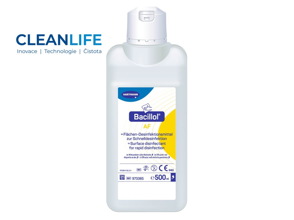 Bacillol® AF 500 ml je profesionální alkoholový dezinfekční přípravek určený pro rychlou dezinfekci povrchů odolných alkoholu — postřikem nebo otřením. Formulace neobsahuje aldehydy, barviva ani parfemaci, což přispívá k vysoké materiálové kompatibilitě a k tomu, že povrch po aplikaci nezůstává lepkavý nebo se na něm neusazují zbytky.