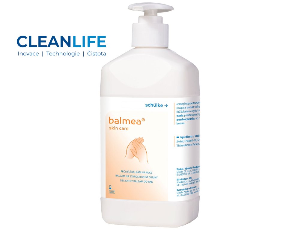 Balmea balzám 500 ml je jemná ošetřující emulze typu olej ve vodě, určená pro ruce a zápěstí vystavené častému mytí, dezinfekci či práci s rukavicemi. Obsahuje kvalitní olivový olej (Olea Europaea) a panthenol, které podporují pružnost pokožky, zmírňují vysušení a pomáhají její rychlejší regeneraci.