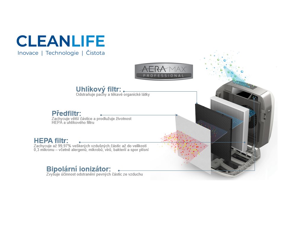 Uhlíkový filtr pohlcuje pachy (nejde tedy pouze o jejich maskování) a těkavé organické sloučeniny (VOC). Využívá k tomu granulované aktivní uhlí. - True HEPA filtr zachytí až 99,97% veškerých jím procházejících částic - a to až do velikosti 0,3 mikronu (viry, bakterie, spory plísní, roztoči a další alergeny)! Navíc jsou HEPA filtry opatřeny antimikrobiální úpravou, která brání růstu plísní, hub a bakterií zachycených v něm.