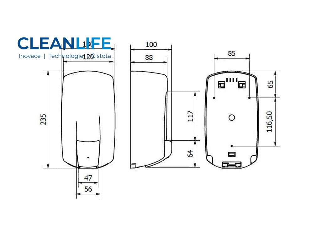 Velkou výhodou je možnost doplňování bez speciálních kazet — náplň (dezinfekce nebo mýdlo) lze nalít přímo do vnitřní nádoby. Mechanismus umožňuje ovládání stiskem ruky nebo loktem, což přispívá k vyšší hygieně v prostředí s častým používáním.