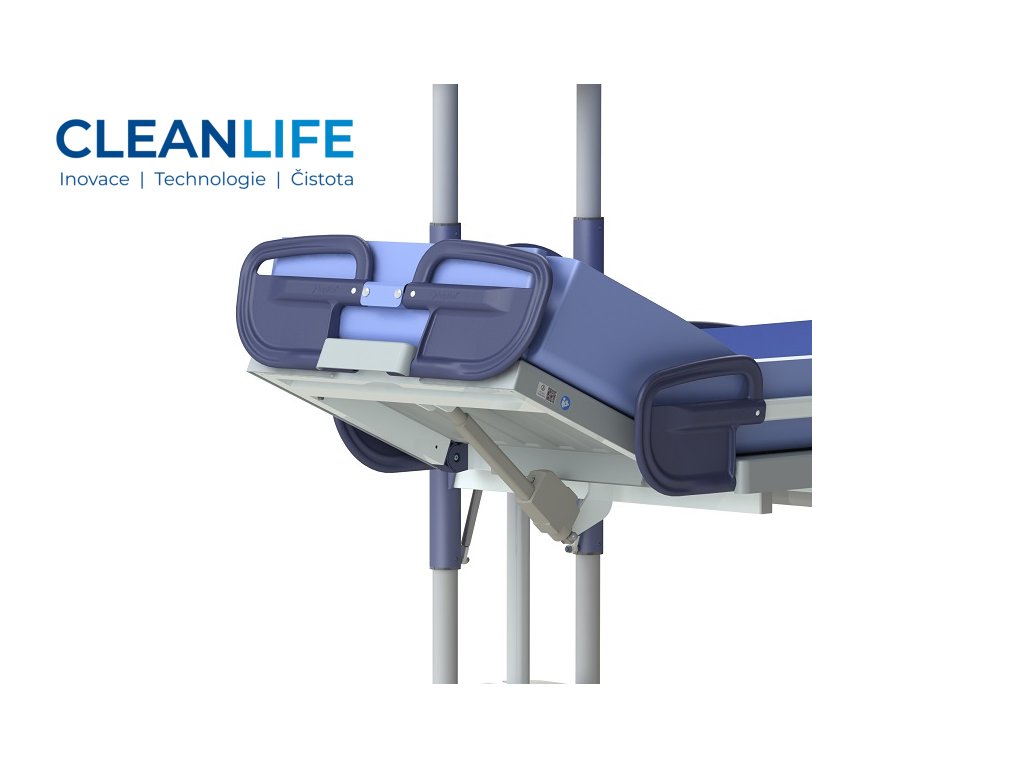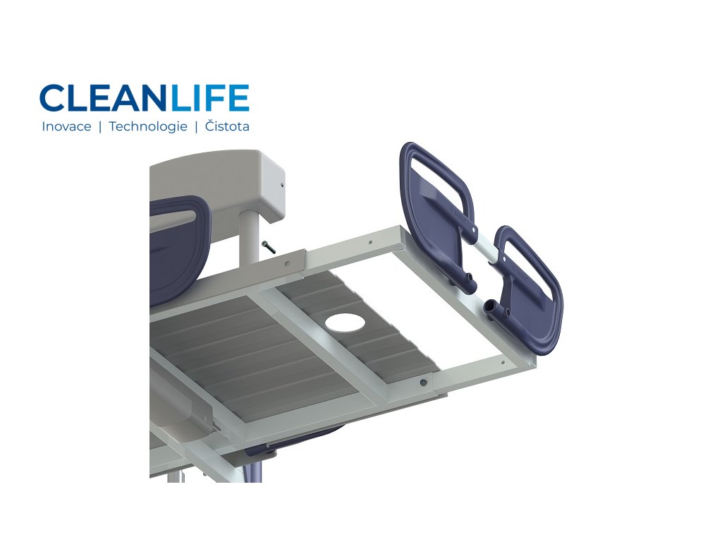 Polohovatelná zádová část umožňuje přizpůsobení pozice klienta, čímž se zvyšuje komfort i dostupnost pro ošetřující personál. Boční výklopné zábrany zvyšují bezpečí při sprchování a manipulaci. Celkové provedení je přizpůsobeno nárokům zdravotnických a sociálních zařízení – konstrukce z hliníku je antikorozní, snadno omyvatelná a hygienická.