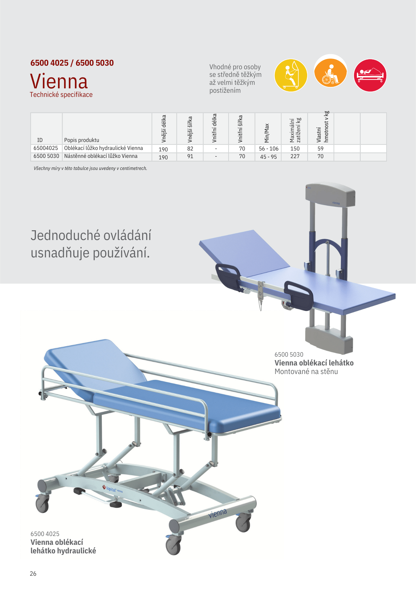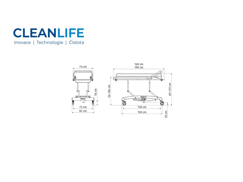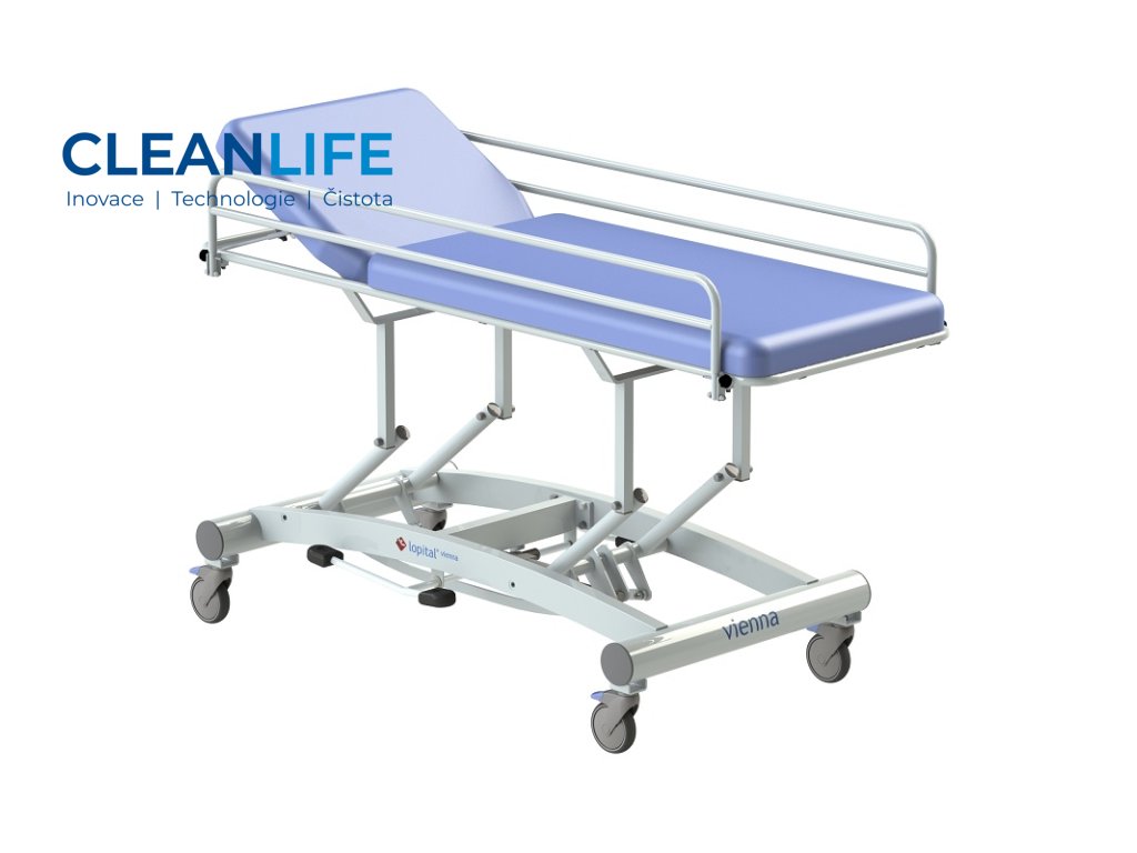 Lehátko Vienna je navrženo pro péči o osoby s omezenou mobilitou. Hydraulické nastavení výšky zajišťuje komfort pro jakéhokoli pečujícího bez nadměrné fyzické námahy. Dvojitá brzděná otočná kolečka umožňují stabilní přesun a aretaci lehátka přesně tam, kde je potřeba. Boční zábrany zajišťují bezpečný prostor při manipulaci a brání pádu klienta během oblékání.
