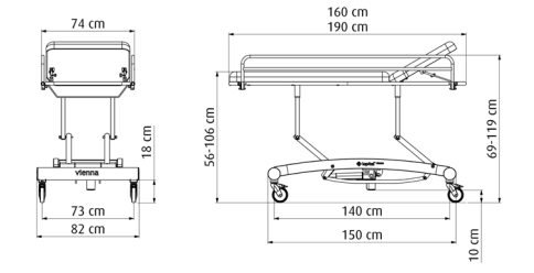 Funkce a prvky: Oblékací lehátko Vienna je vybaveno výškovým nastavením pomocí hydraulického ovládání v rozsahu 56 až 106 centimetrů, které umožňuje přizpůsobení pracovní výšky podle potřeb ošetřující osoby. Čtyři otočná kolečka z nerezové oceli jsou opatřena dvojitým brzděním pro bezpečné zajištění lehátka na místě. Boční sklopné zábrany chrání klienta během polohování a přispívají k celkové bezpečnosti při oblékání. Ležící plocha je ergonomicky tvarovaná, potažená hygienickým materiálem, který je příjemný na dotek a zároveň snadno omyvatelný. Stabilní rámová konstrukce zajišťuje pevnost a spolehlivost v každodenním provozu a umožňuje využití v zařízeních sociální a zdravotní péče.