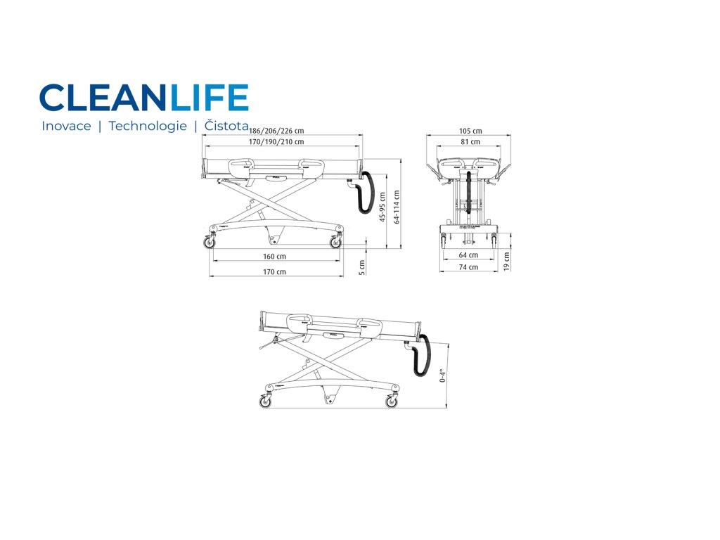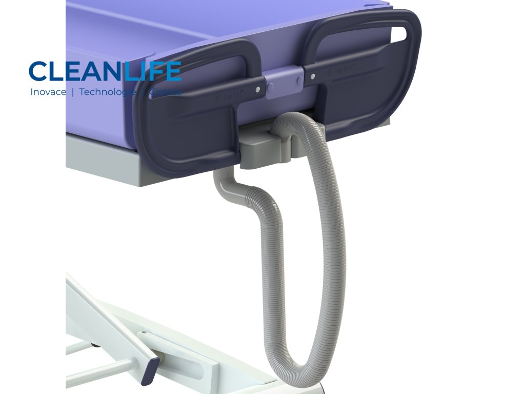 - Elektrické nastavení výšky v rozmezí 45–95 cm – zajišťuje ergonomickou práci pečovatelů a snadný přístup k pacientovi.