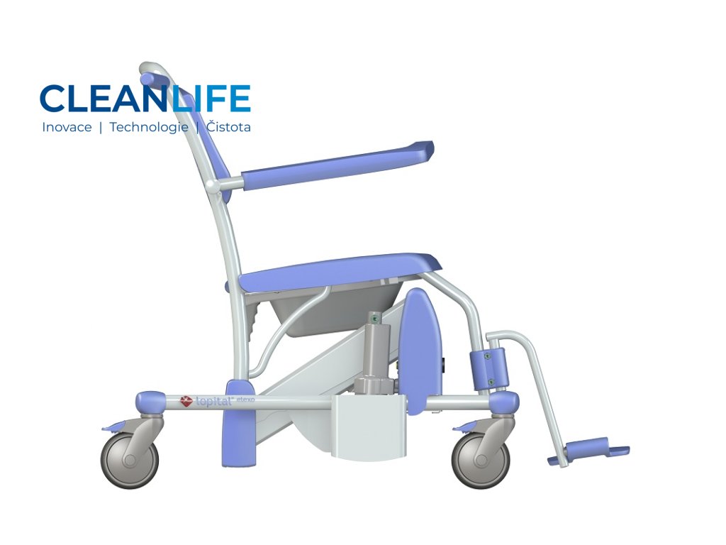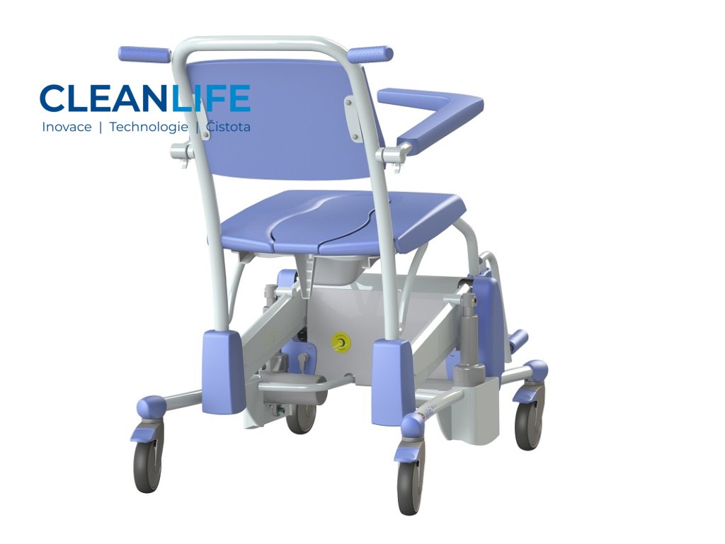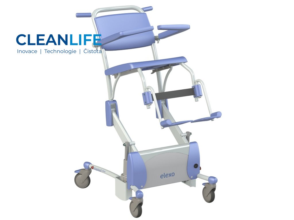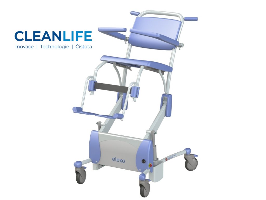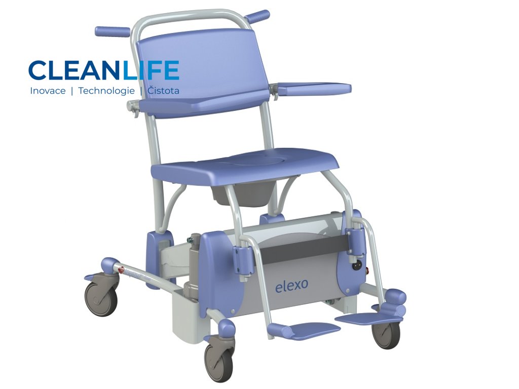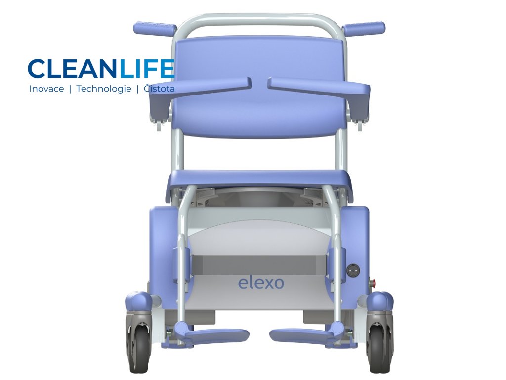 Sprchovací a toaletní židle Elexo je navržena tak, aby kombinovala funkčnost, bezpečnost a pohodlí při každodenní hygieně pacientů. Elektrické polohování výšky sedu i náklonu opěradla umožňuje snadnou adaptaci na potřeby uživatele, a zároveň chrání záda pečujících. Otevřený rám a hladké povrchy usnadňují čištění a minimalizují riziko křížové kontaminace. Židle je vybavena ergonomickými opěrkami, bezpečnostním pásem, odnímatelnou nádobou pod sedákem a koly s brzdou pro snadnou manipulaci.