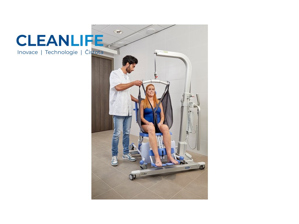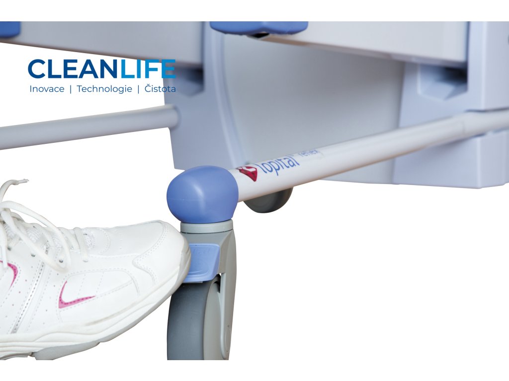 - Bezpečné ovládání – dotykové panely, skladací opěrky, brzděná kolečka.