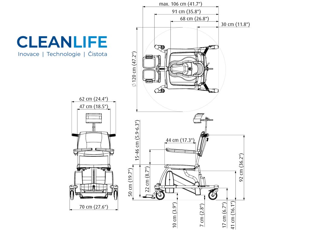 - Prostorově přívětivý design – kompaktní rotační poloměr 120 cm.