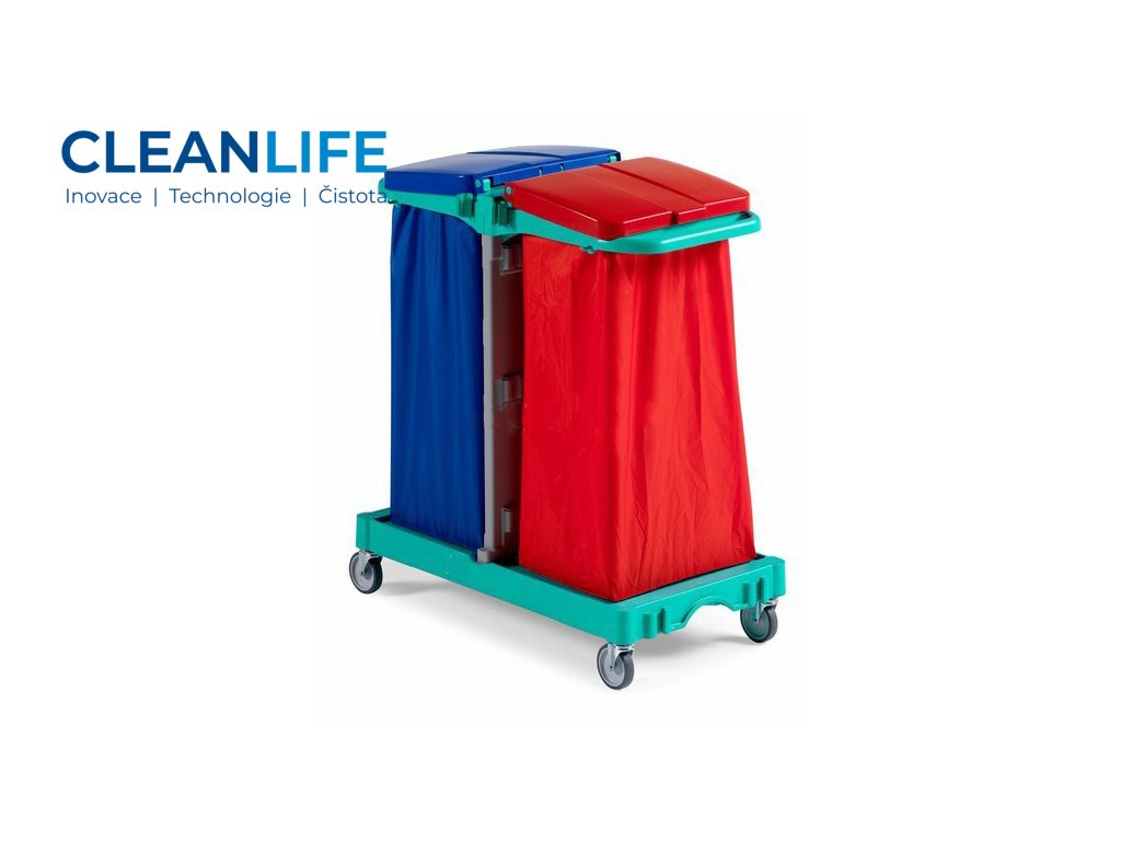 Ergonomický držák vaků umožňuje jejich snadné upevnění i vyjmutí bez nutnosti zvedat obsah – to snižuje fyzickou zátěž obsluhy a zvyšuje komfort při práci. Vozík je osazen kolečky o průměru 100/125 mm, která zajišťují plynulý a stabilní pohyb i na hladkých podlahách.
