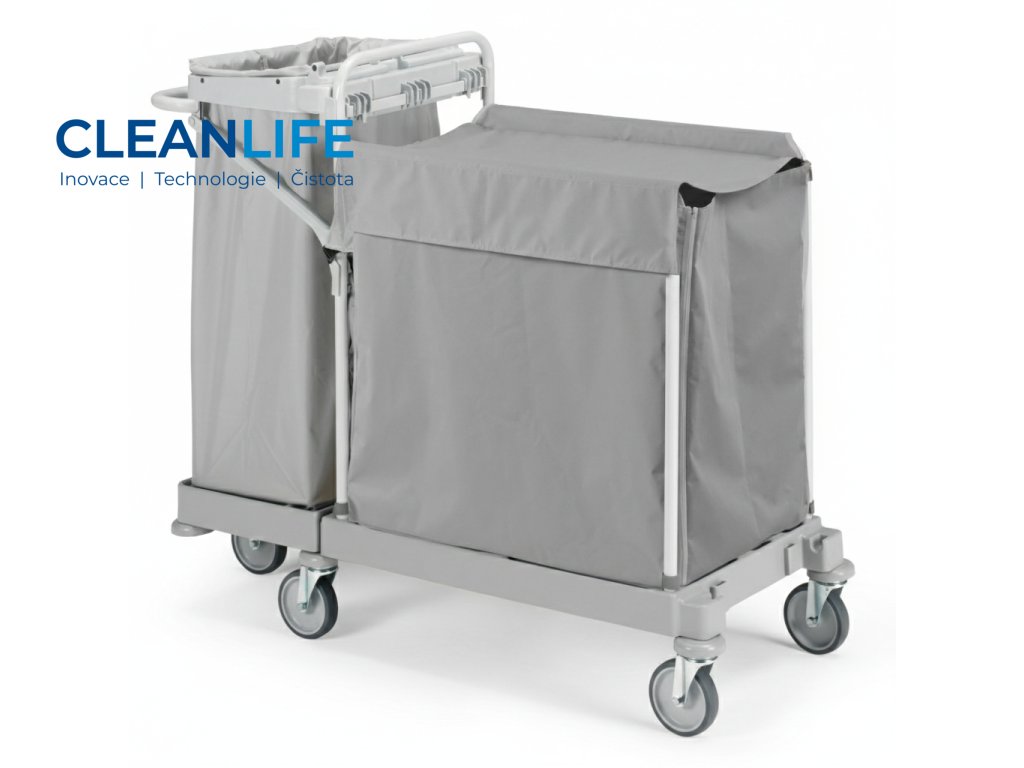 Vozík je vybaven dva vaky – jeden plastifikovaný 120 l s držákem a další 200 l s uzavíratelným zipem a krytem, což umožňuje přehledné třídění a větší kapacitu sběru prádla při jediném průchodu. Ergonomický držák drží vaky stabilně na místě a umožňuje jejich vyjmutí bez zbytečného zvedání či namáhavého přesunu.