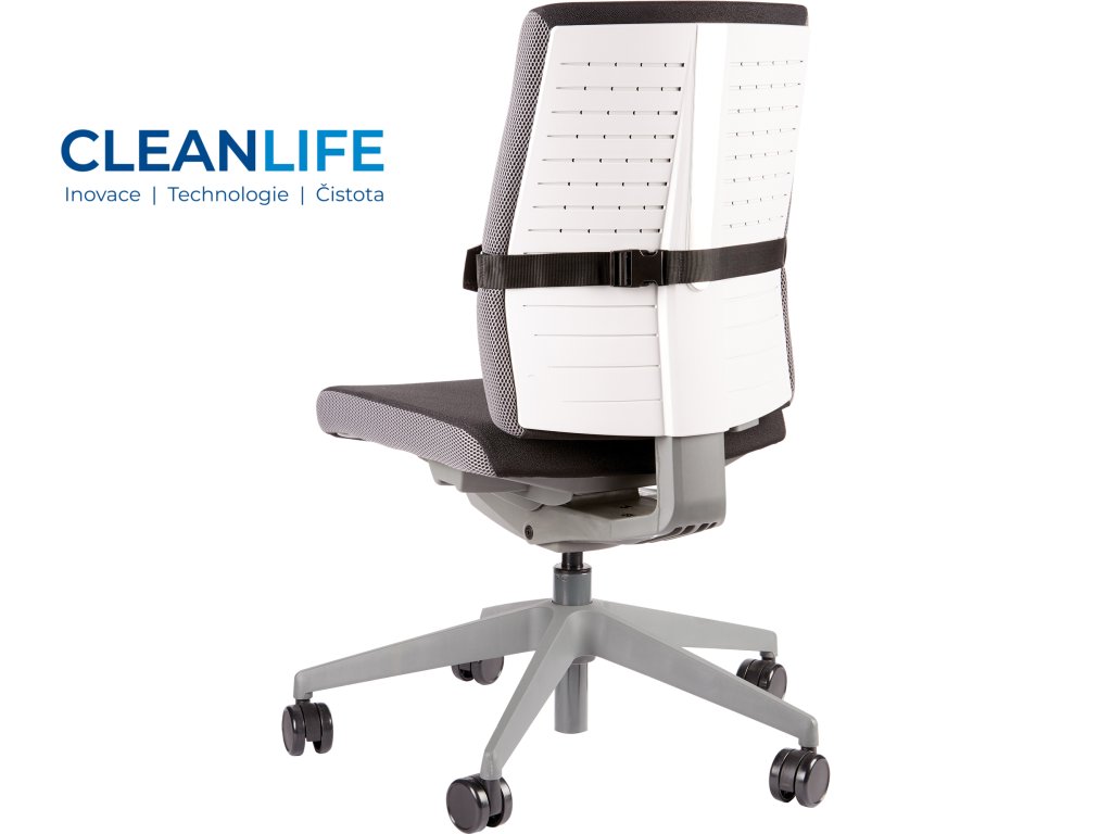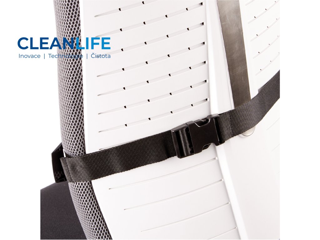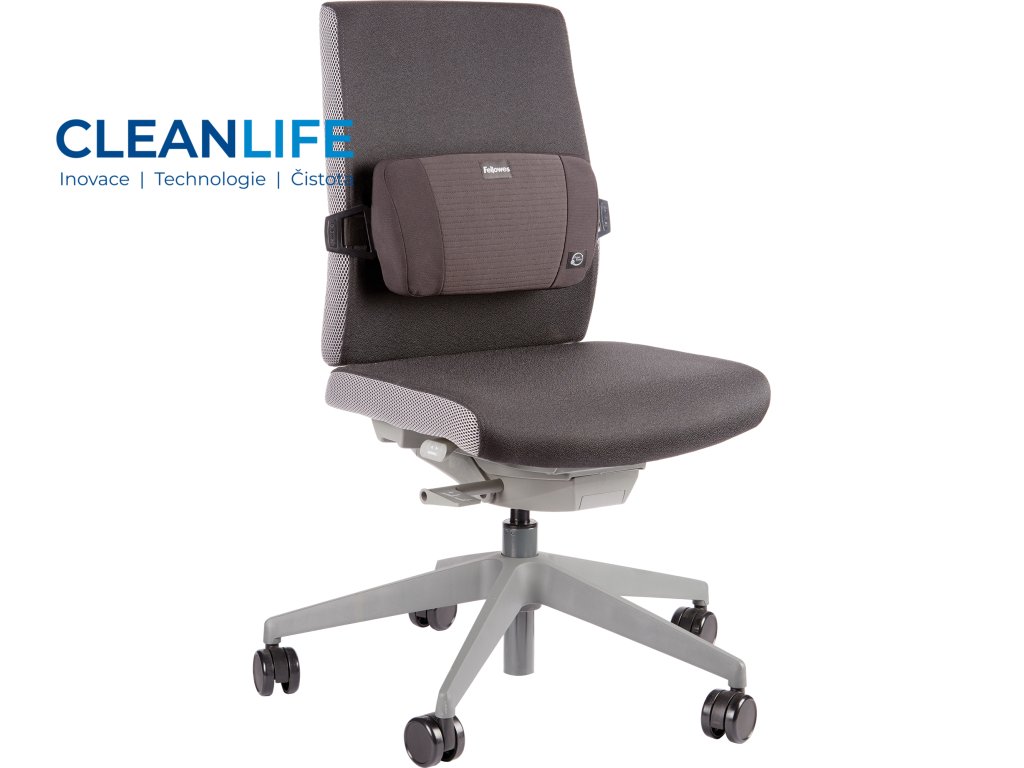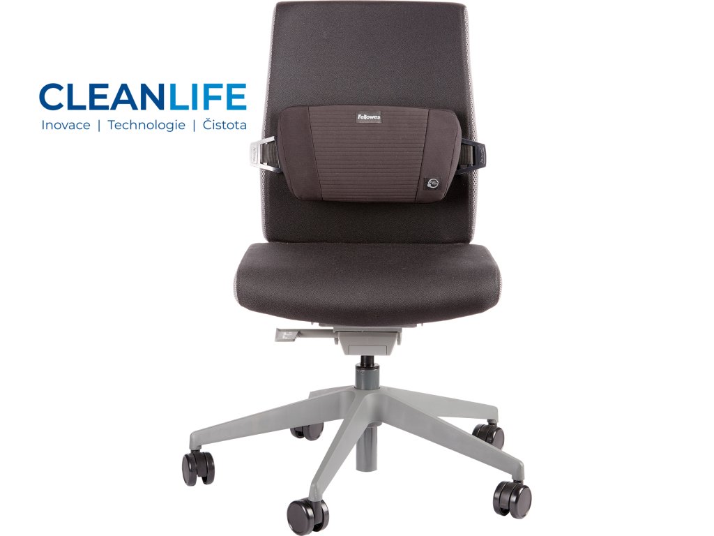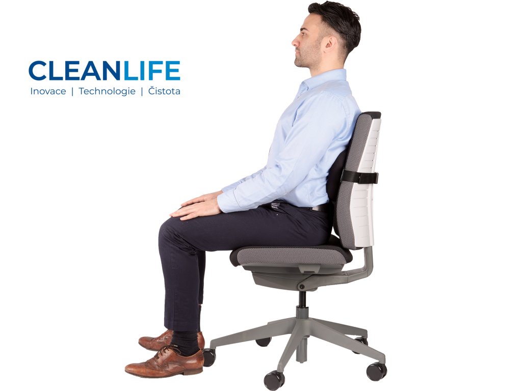 Opěrka je vybavena nastavitelným popruhem s přezkou, který umožňuje snadné uchycení na různých typech židlí a křesel. Její moderní design dodává pracovnímu prostoru elegantní vzhled.